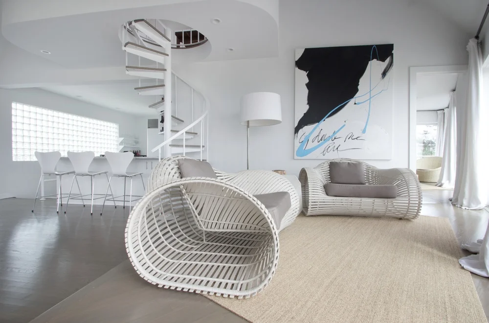 For a Hampton summer home, try an all-white design! Using linens and cottons, this home is perfect for lounging after a long day in the ocean. Sculptural furniture, like these Kenneth Cobonpue Lola Chairs, lets us play with negative space.
