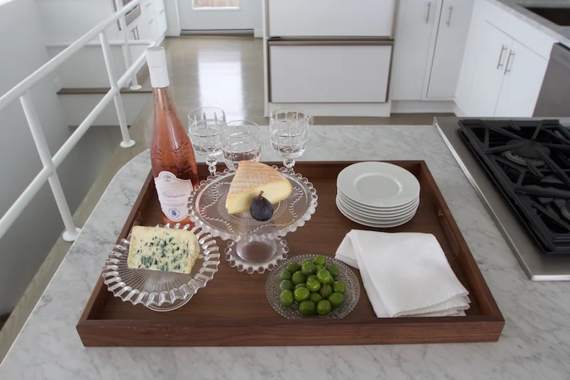 In this Hampton's beach house we used marble, white painted cabinetry and white appliances contrasted with a washed grey wood floor. We chose this walnut wood tray for accent... makes a great backdrop for our clients' pressed glass collection!