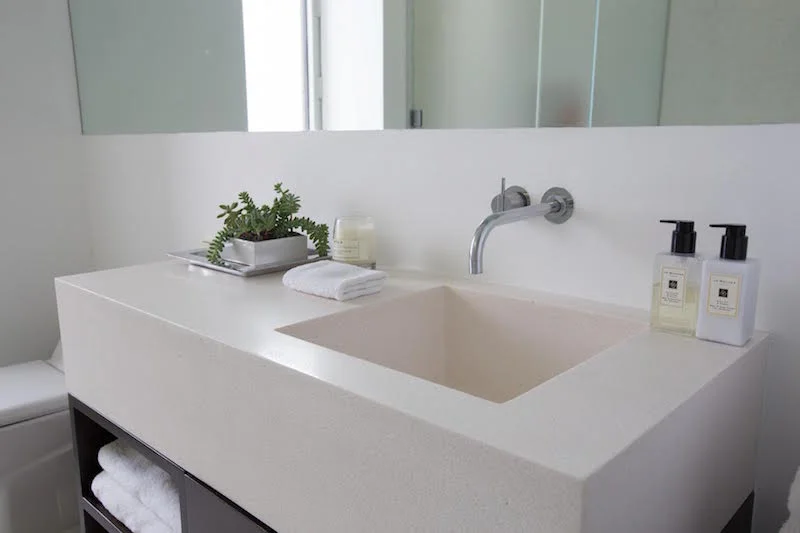 Every bathroom needs it's accessories... our favorites are Jo Malone hand wash in Nectarine Blossom + Honey, hand lotion in Wild Fig + Cassis, and Le Labo candle in Santal 26. Add a succulent for touch of green to an all-white bathroom. Luxurious...